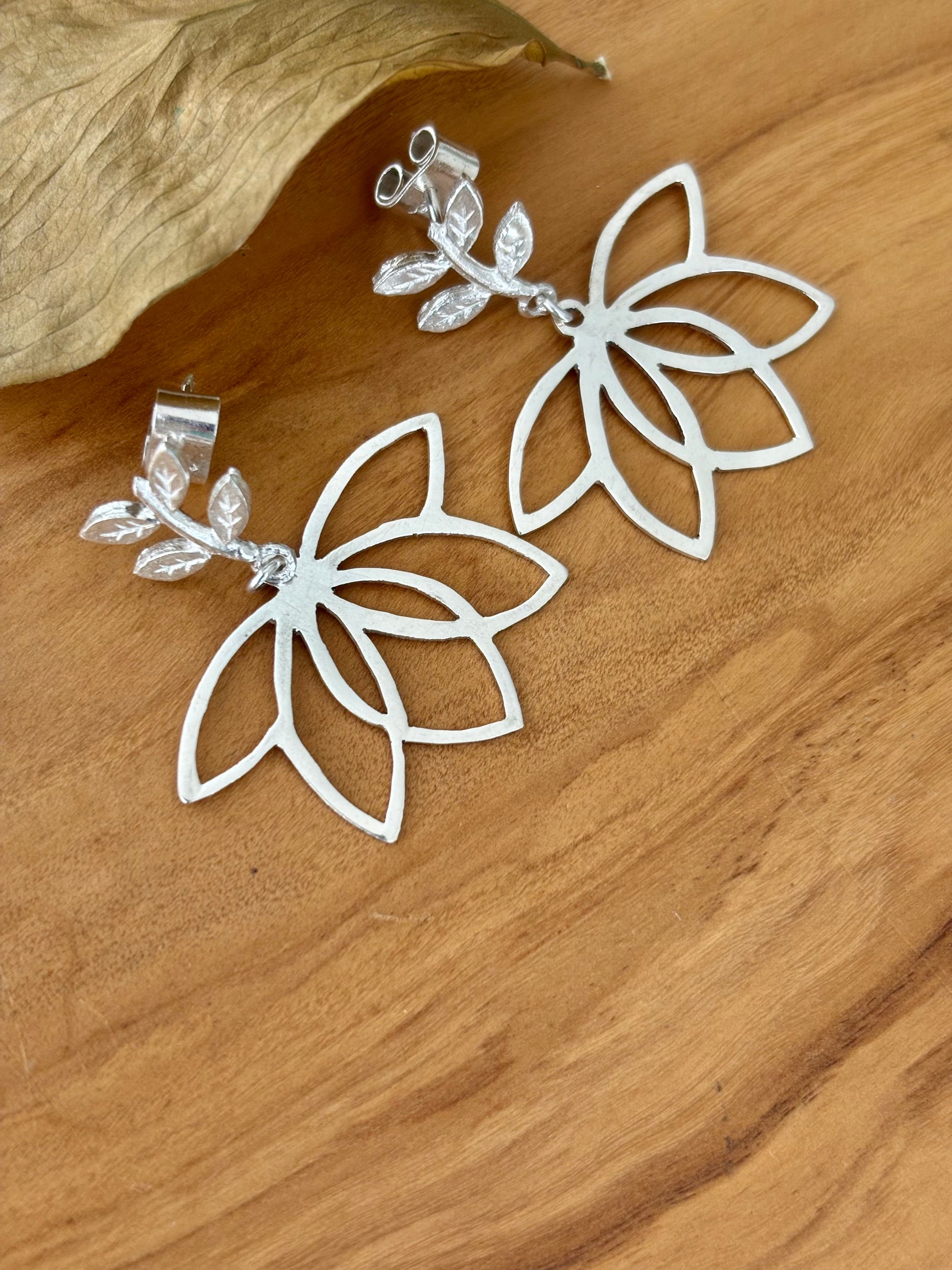 Aretes con rama de plata y flor de Loto invertida colgante.