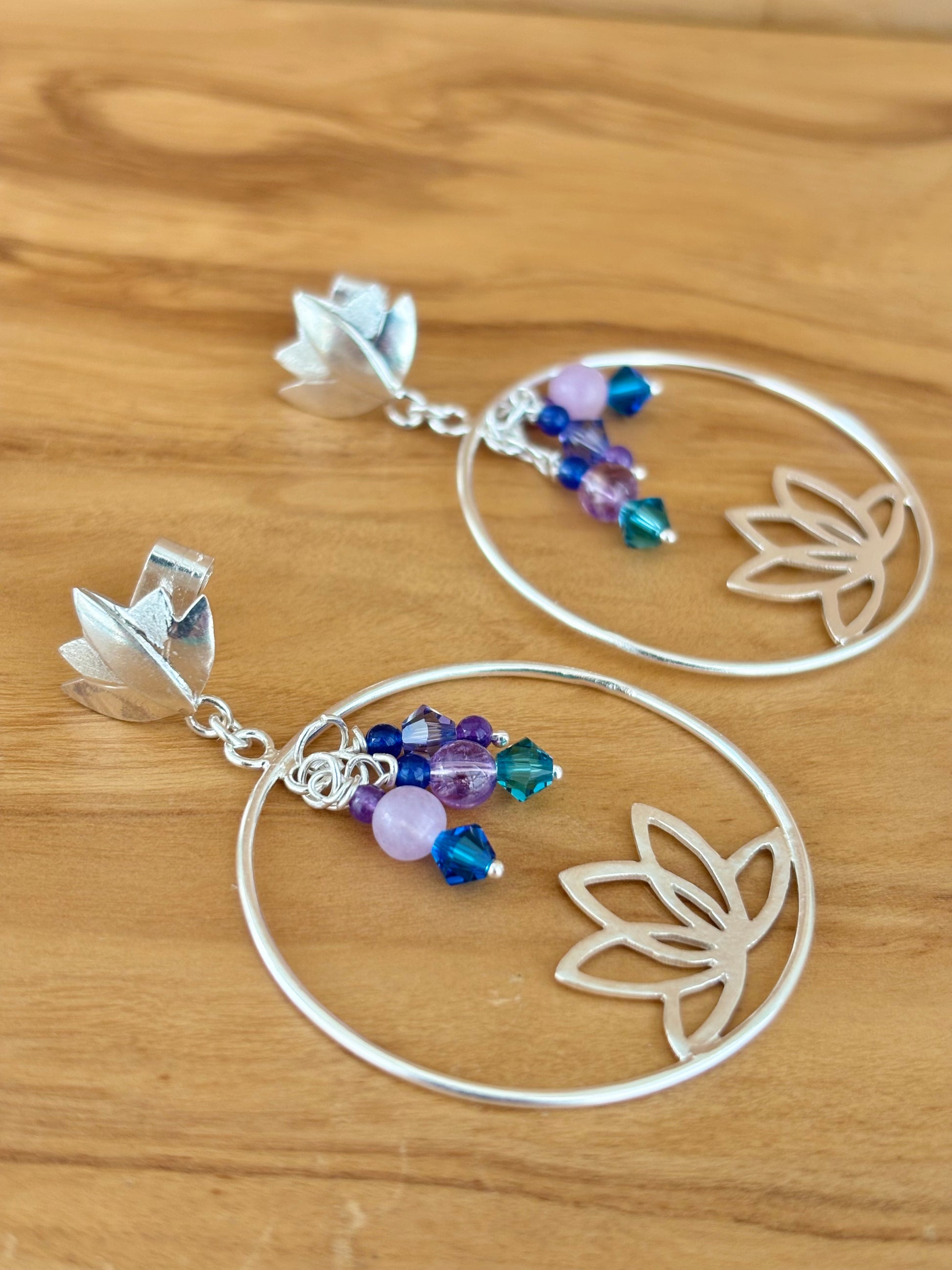 Aretes de aros en plata con flor de Loto y Swarovskis colgantes en tonos azules y morados.