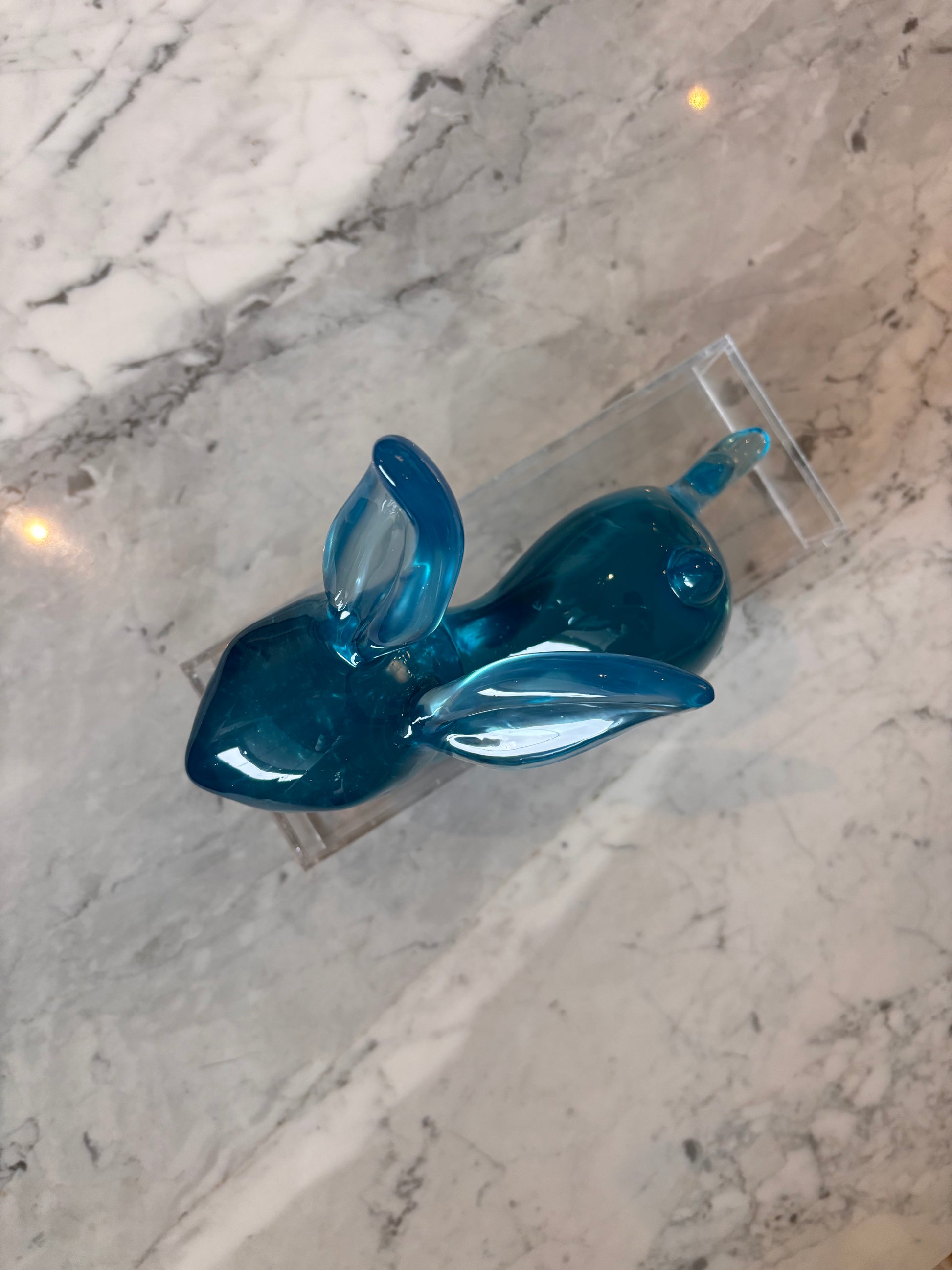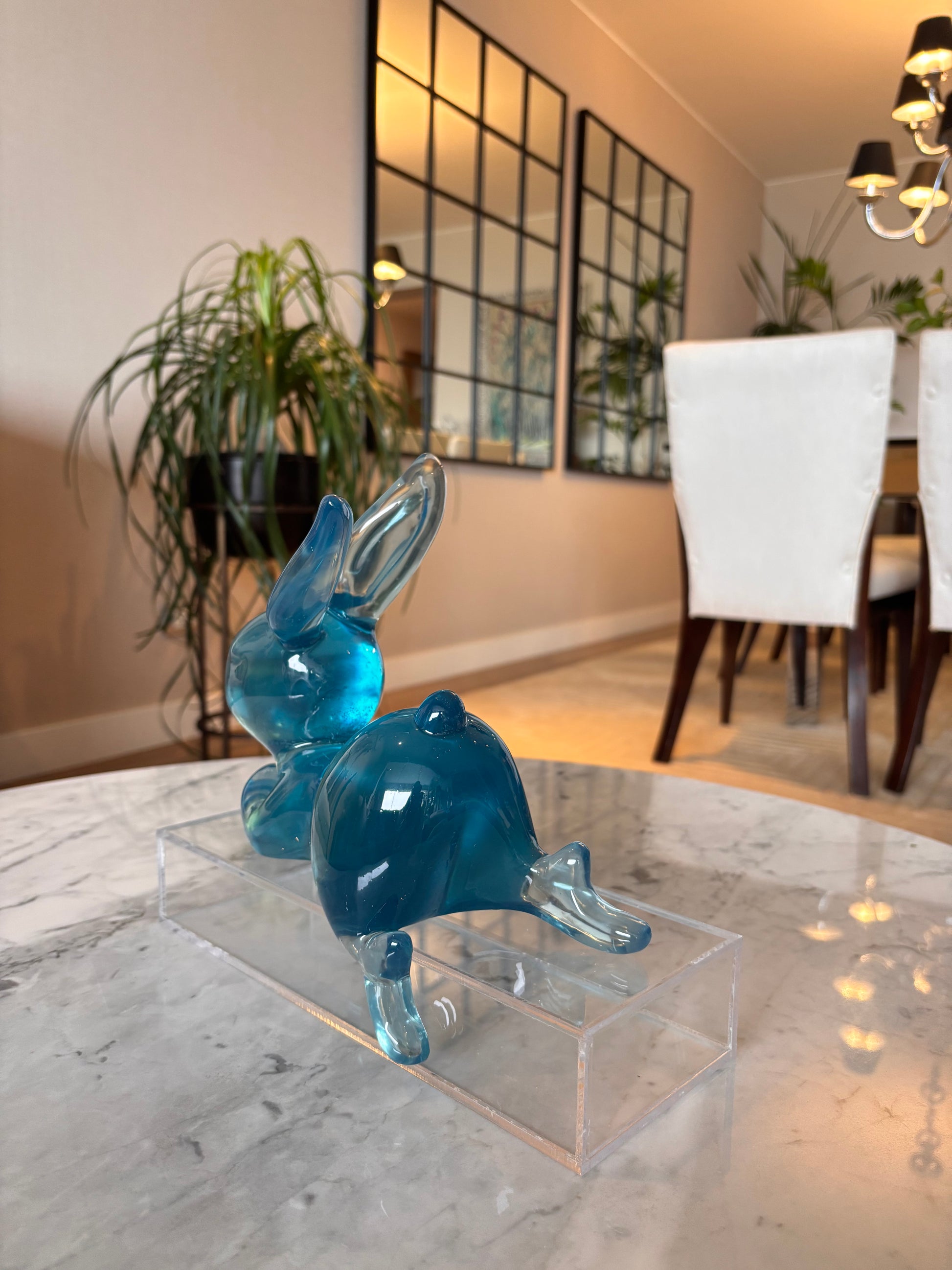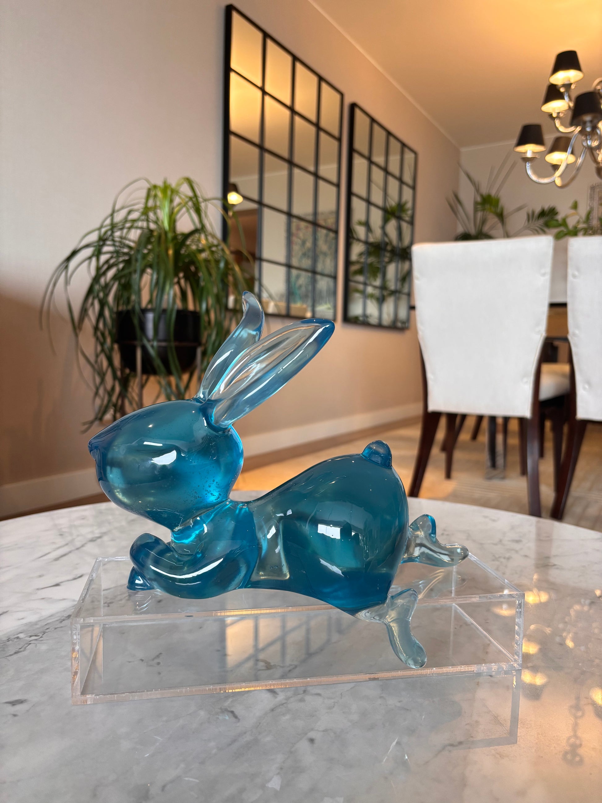 Escultura de coneja Lila hecha a mano en resina traslúcida color turquesa.
