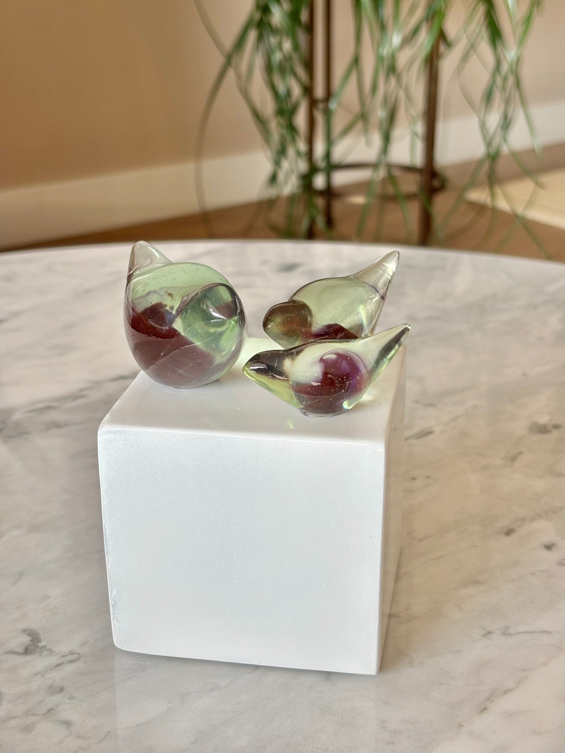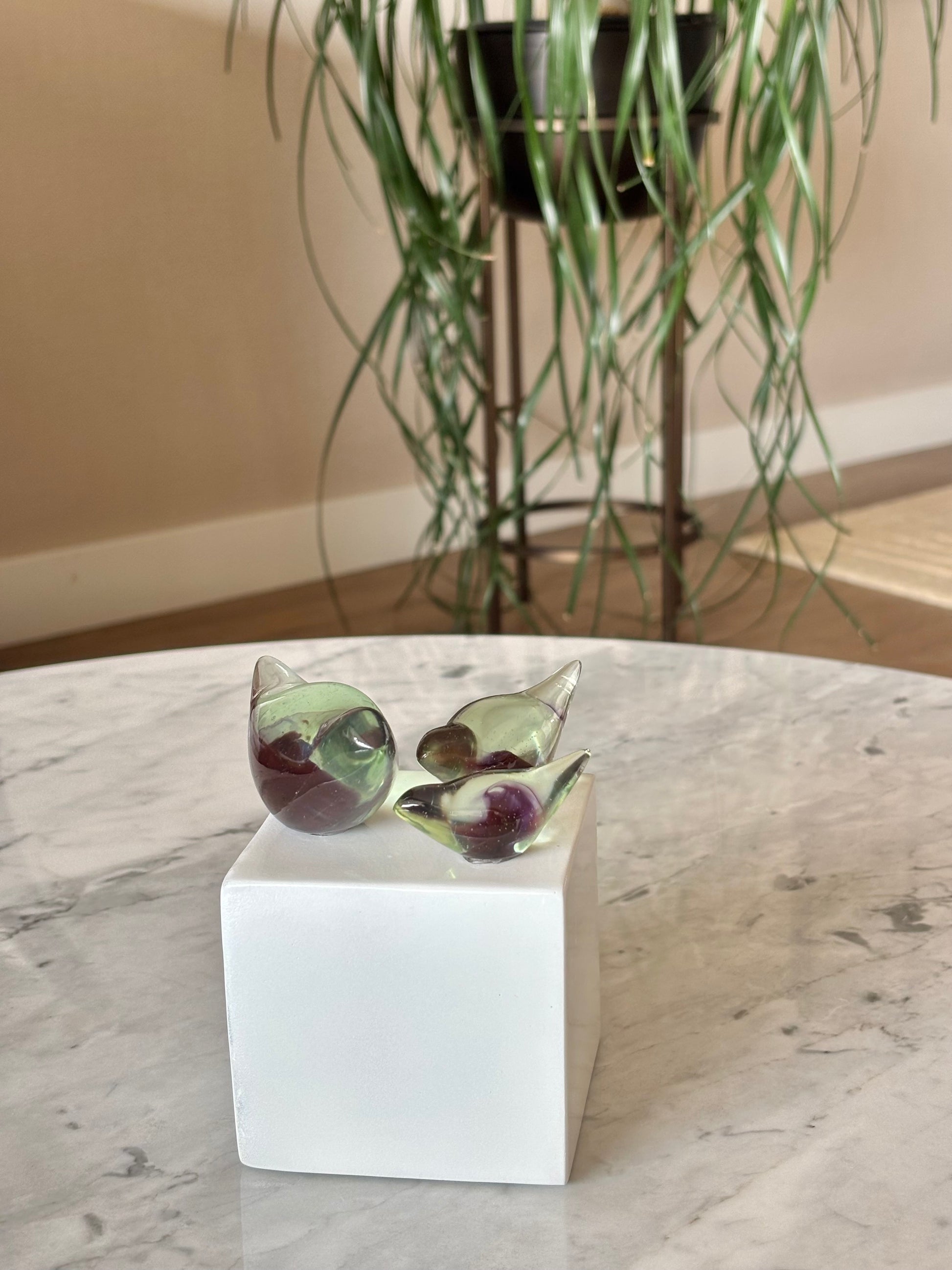 Familia de tres pajaritos hechos a mano en resina sobre base cuadrada de madera blanca.