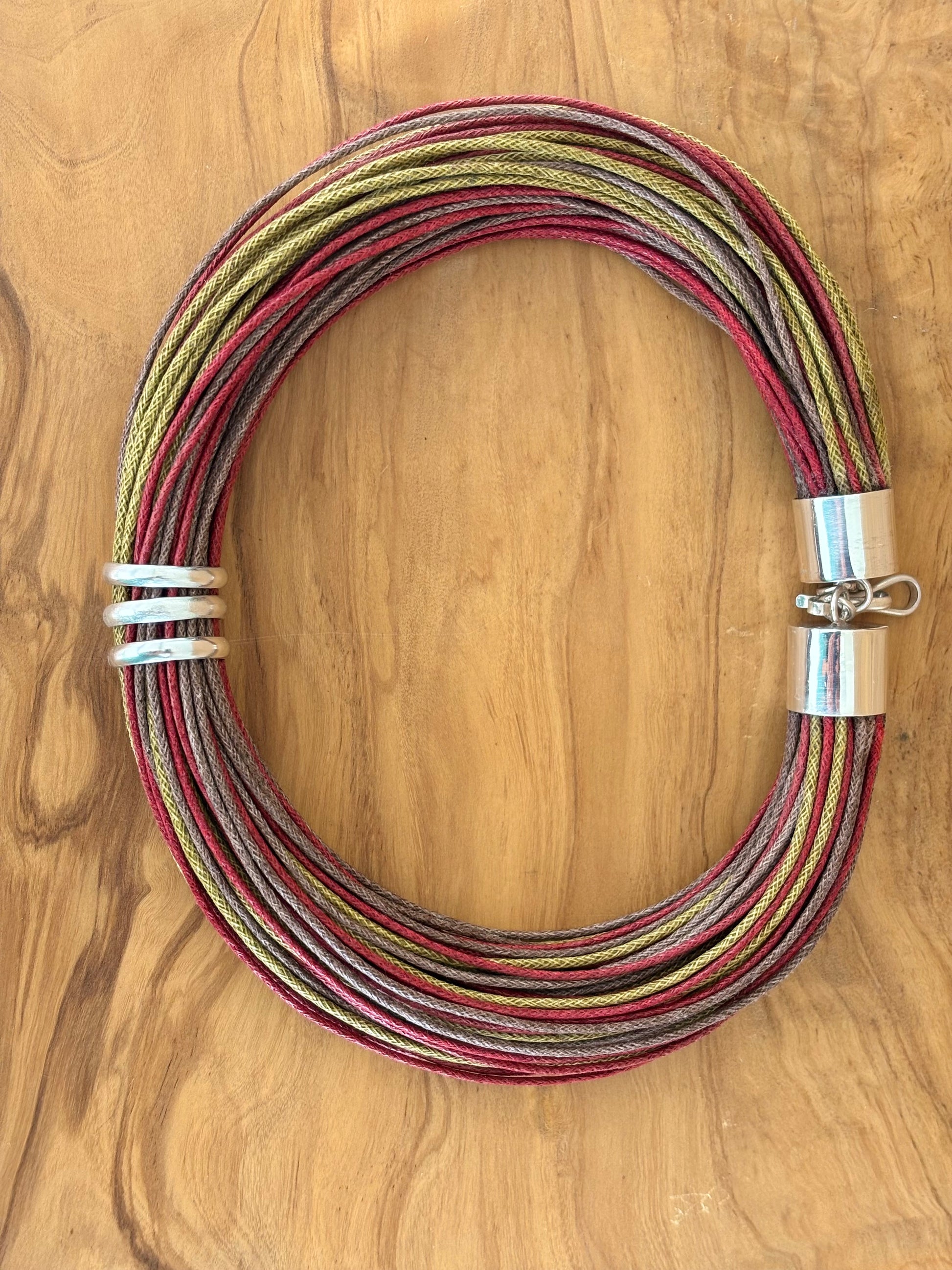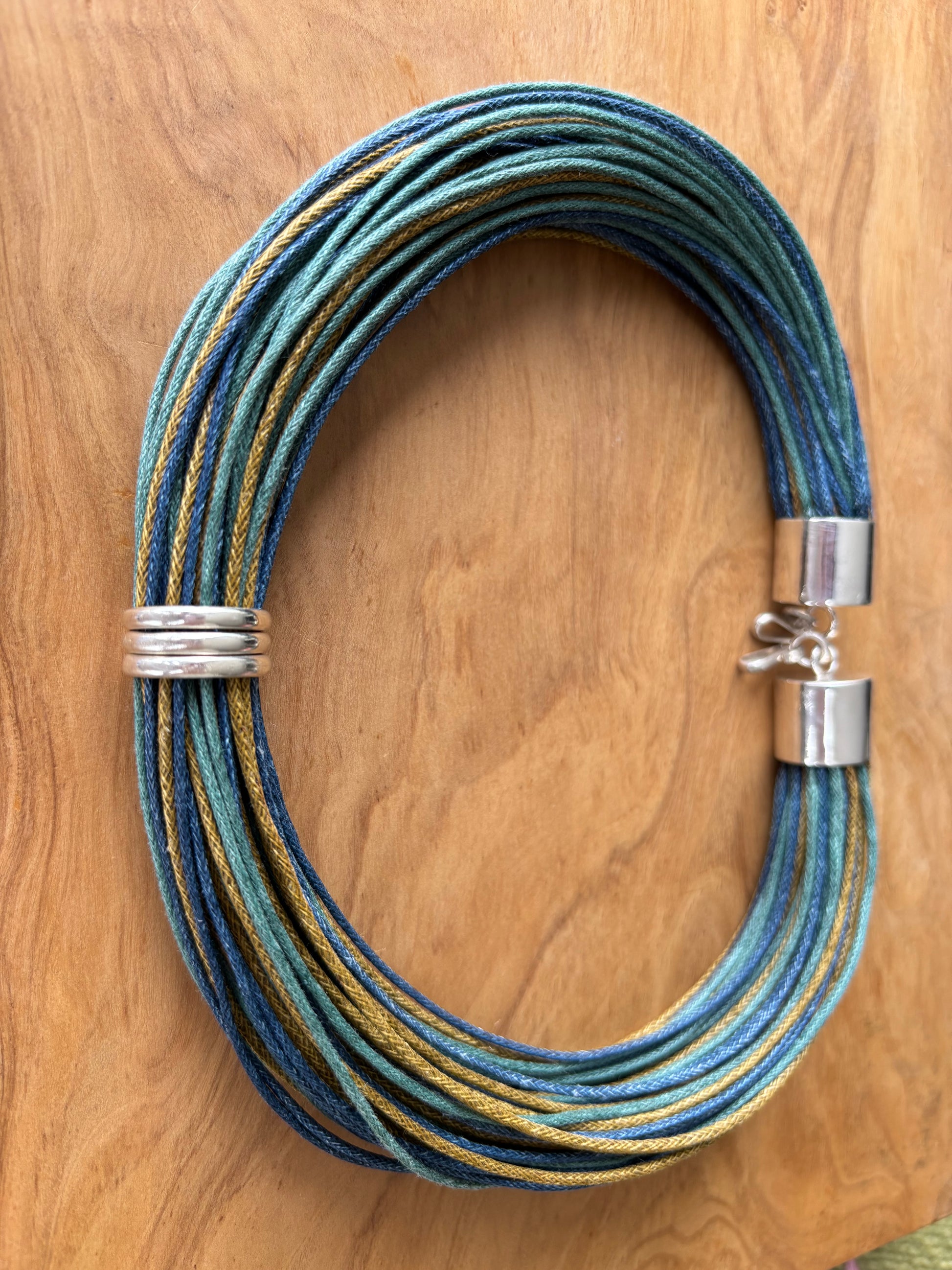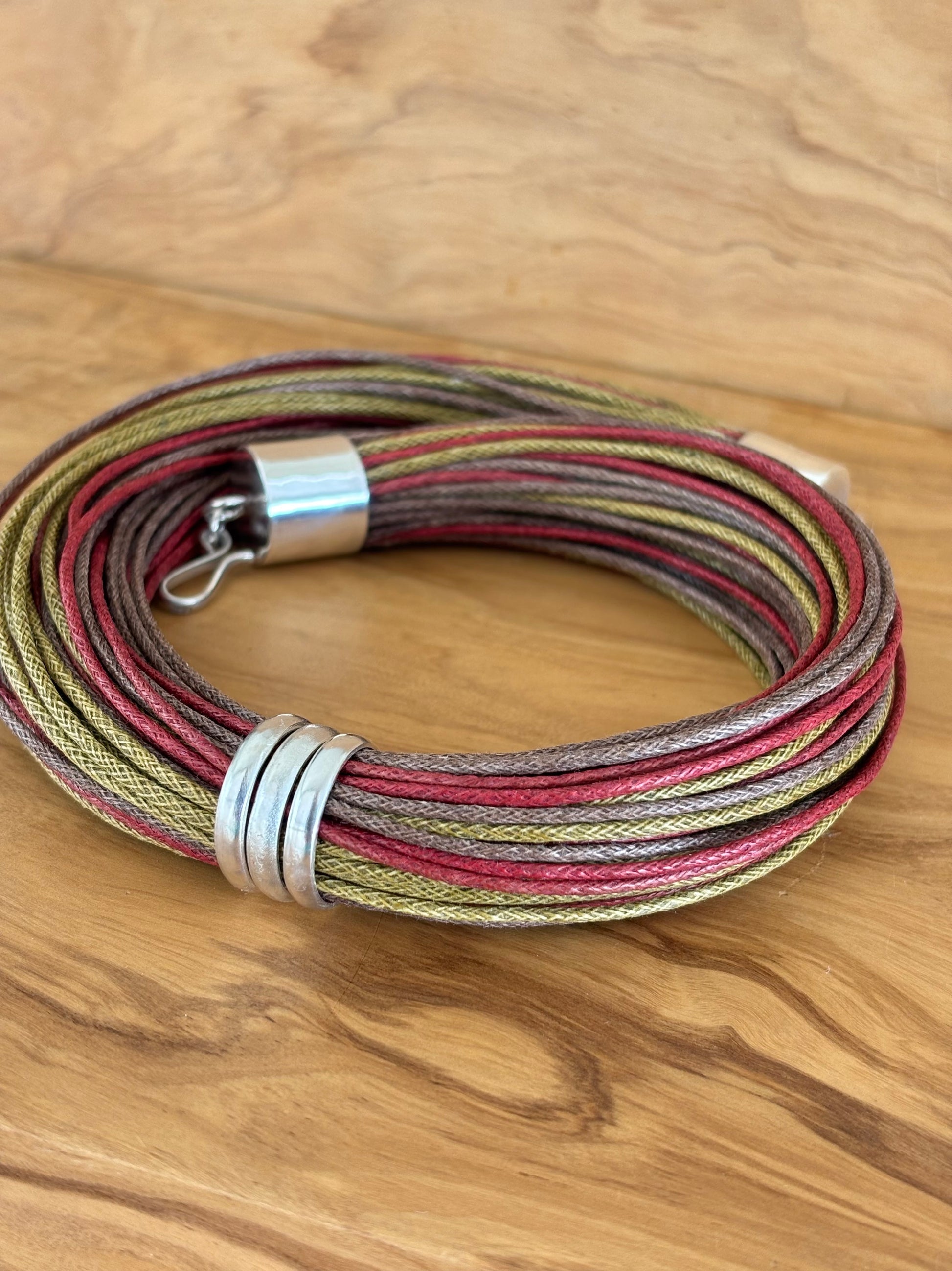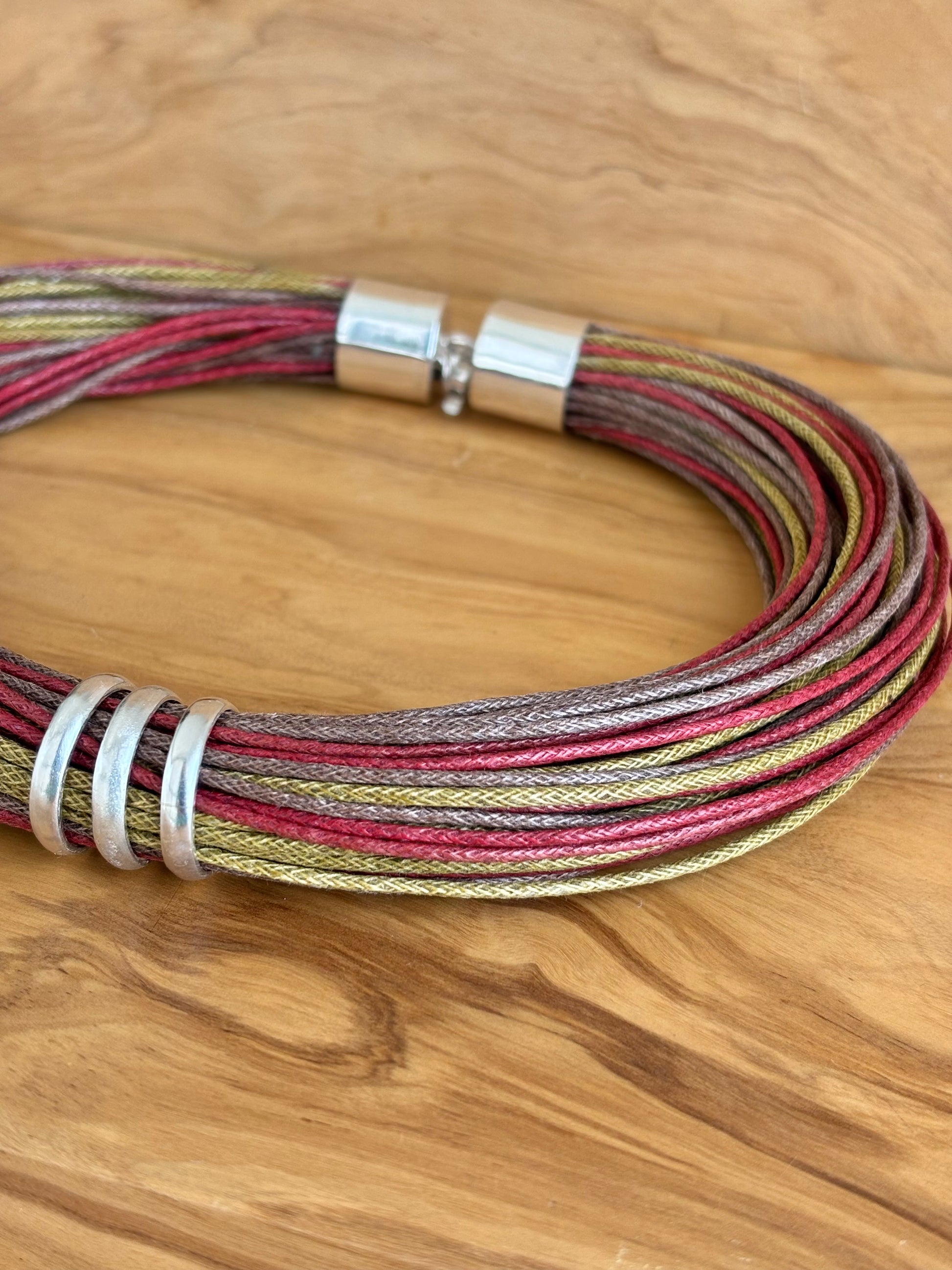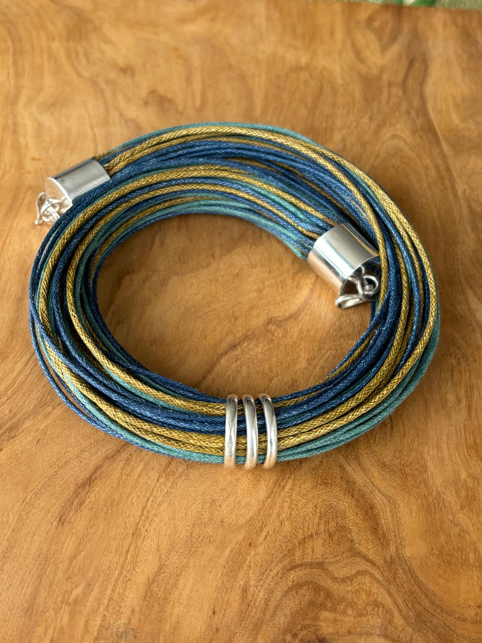 Gargantilla de pitas de algodón con dije de tres aros de plata de diferentes texturas.