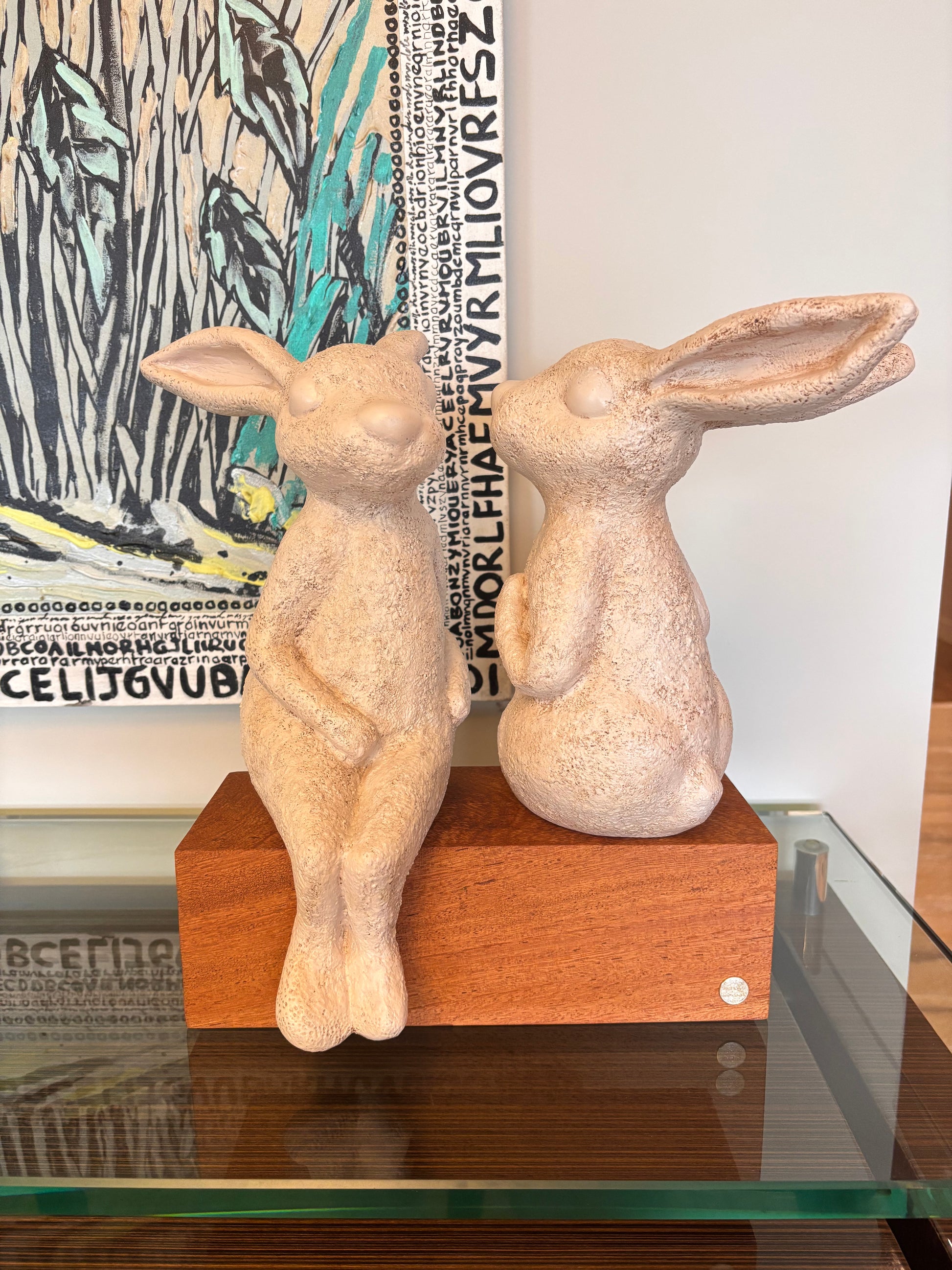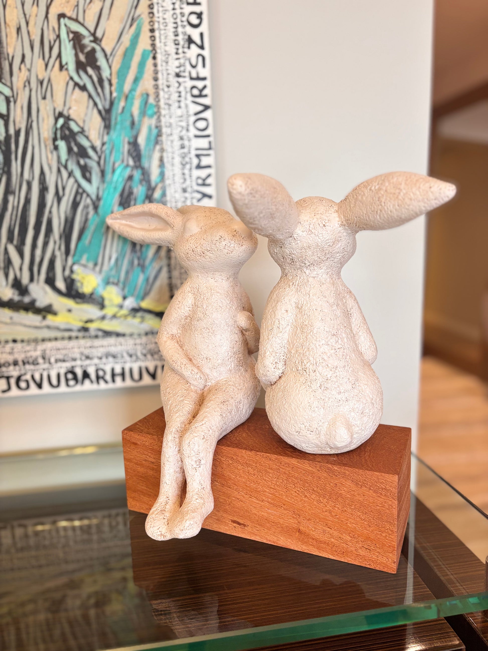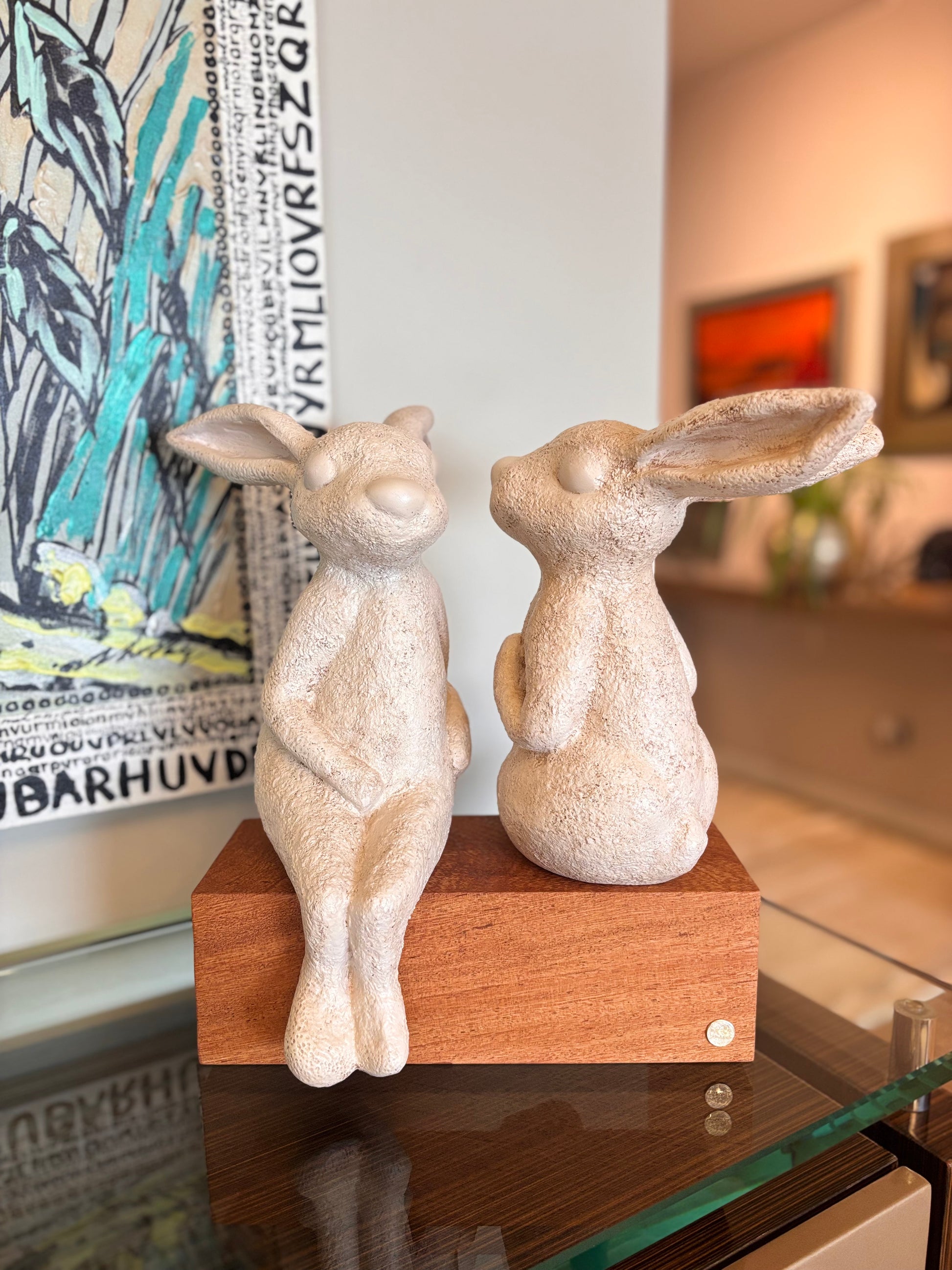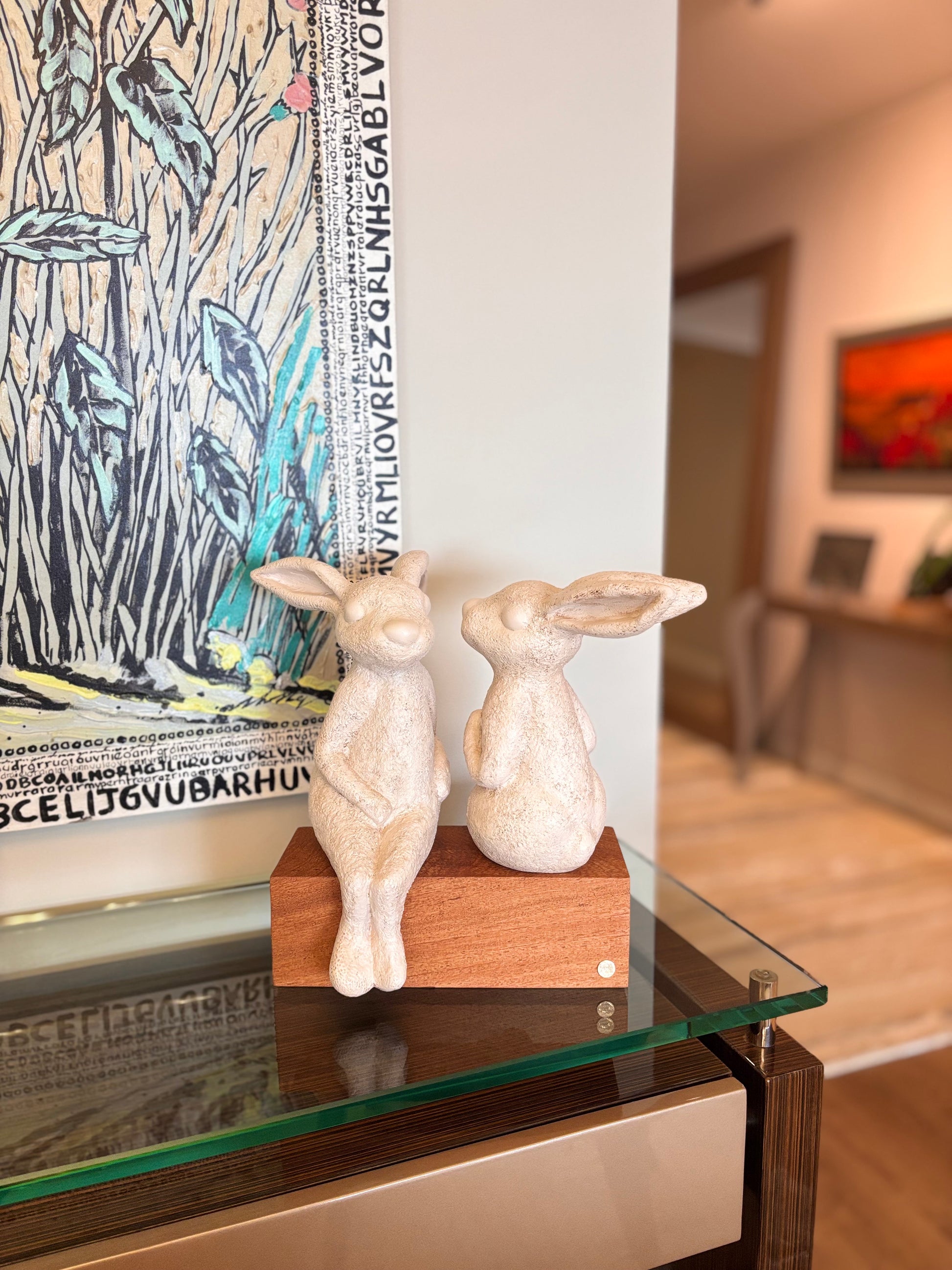 Escultura de pareja de conejos hechos a mano en resina y pintados en acrílico, sentados en base rectangular de madera Huayruro.