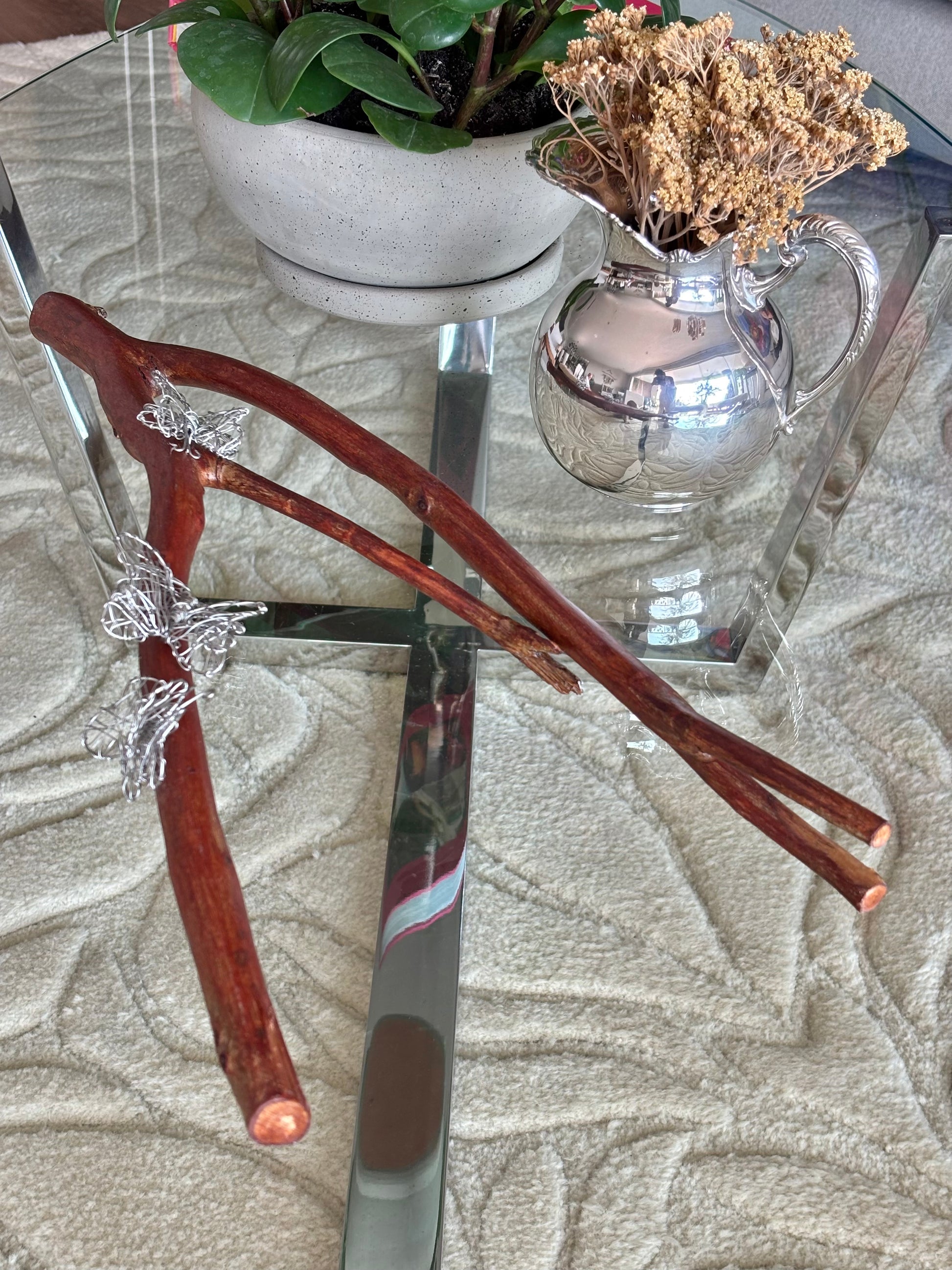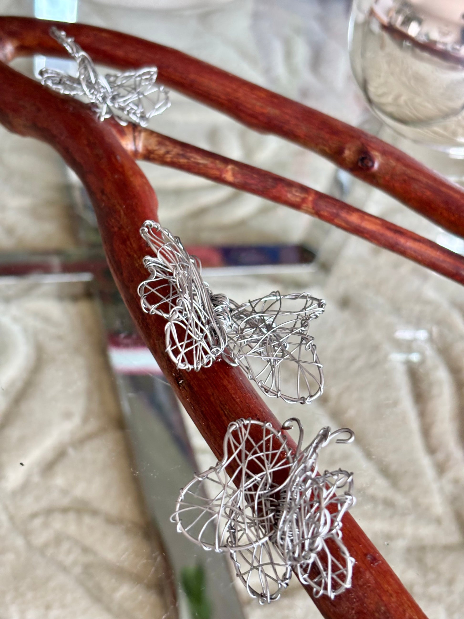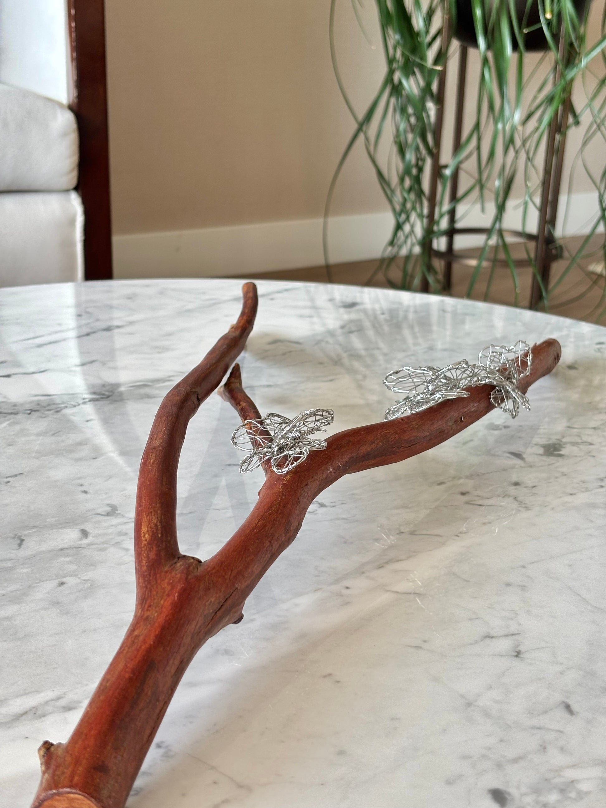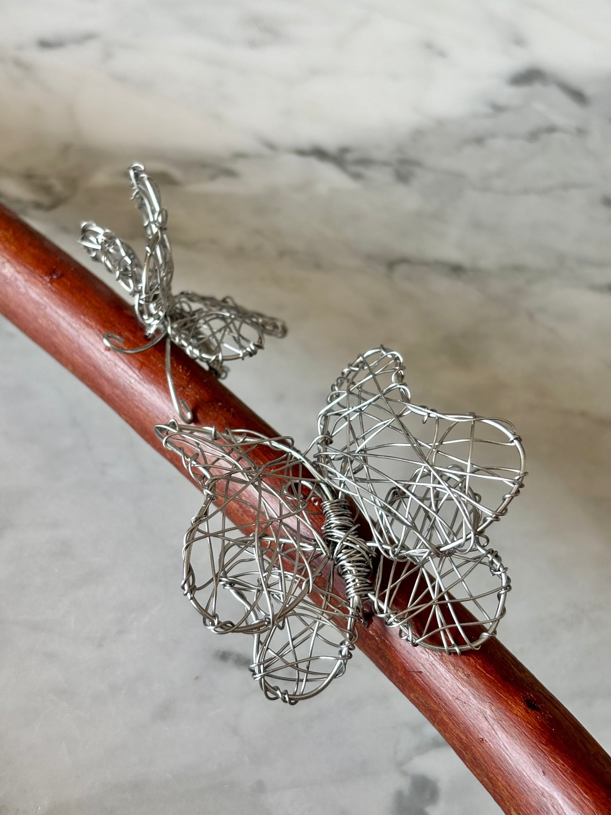 Tronco mediano con 3 mariposas tejidas a mano en hilos de alambre de acero.